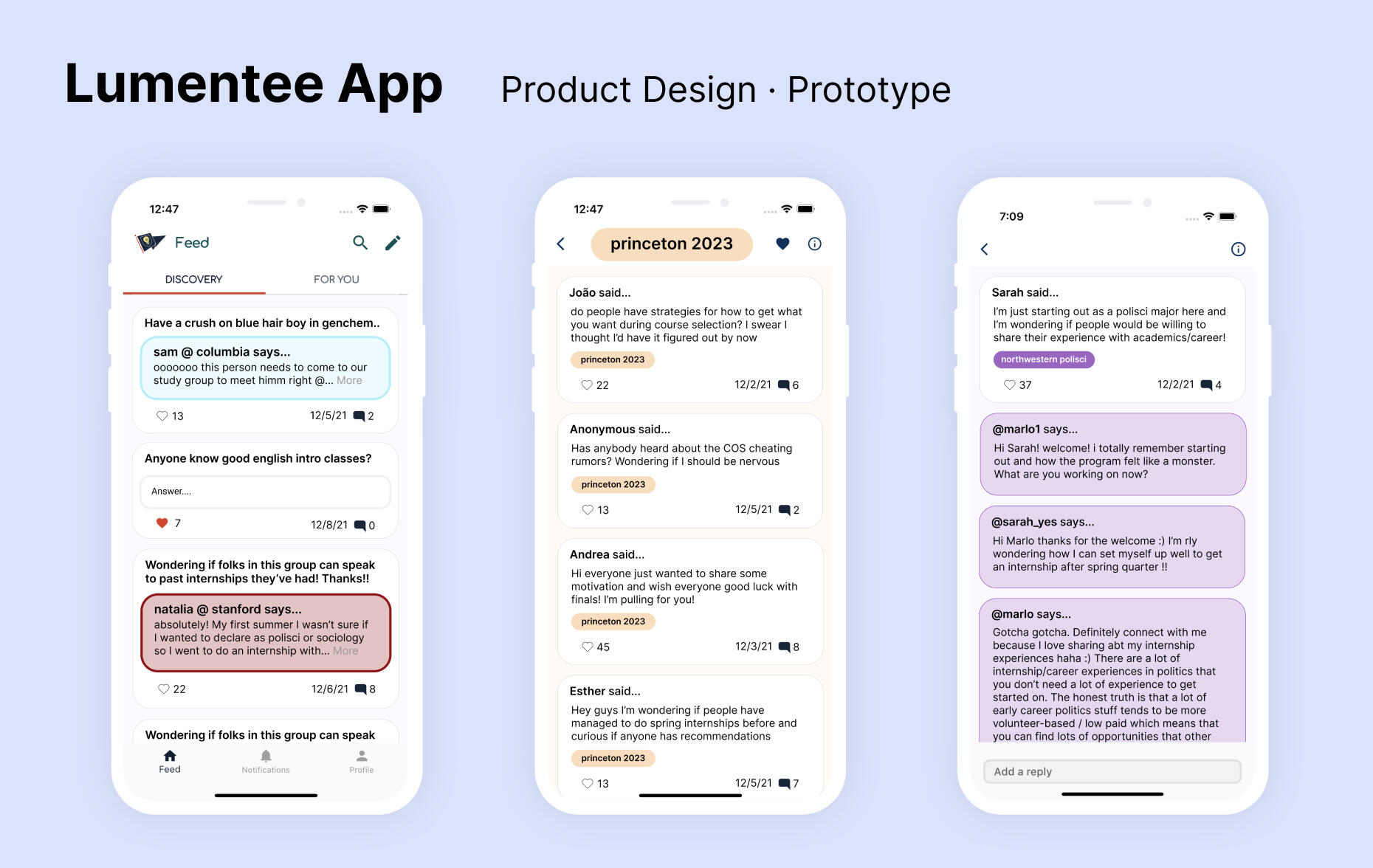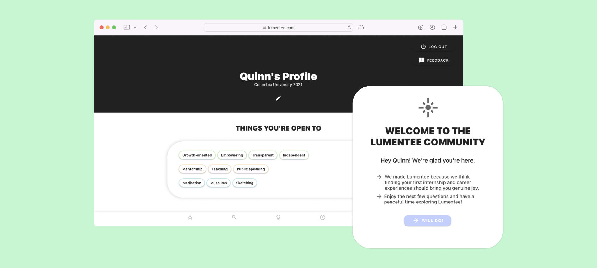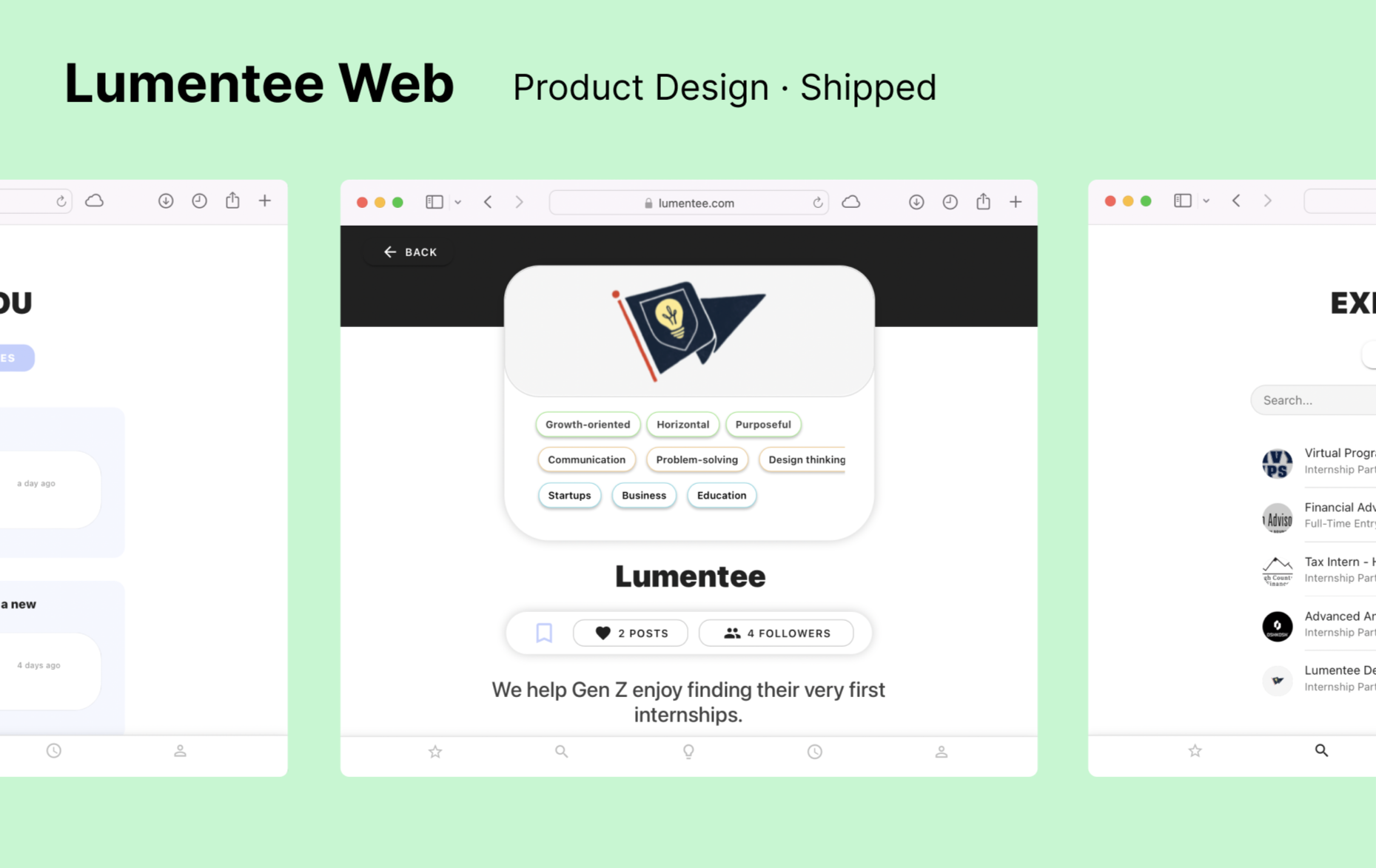 I led the development of Lumentee, a delightful online search platform for underrepresented Gen Z students to discover their first career experience. I established the design system, conducted customer discovery, and built the final product.