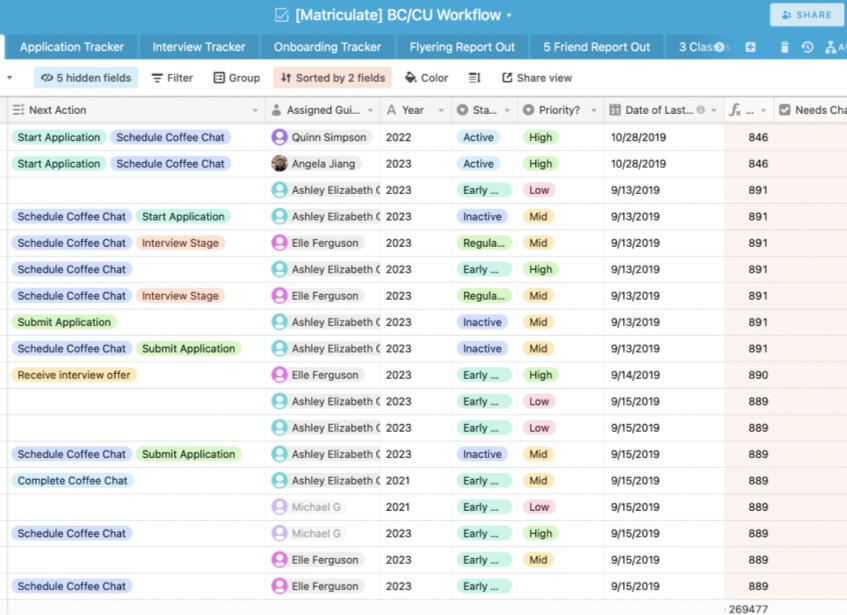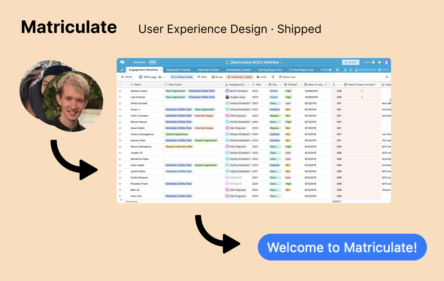 I developed a guide system that paired each potential applicant who submitted a Matriculate interest form with a guide from my team who would shepherd them through the application process. I created a relationship management system using an Airtable base to ensure each applicant was being contacted by the correct person at the correct time.
