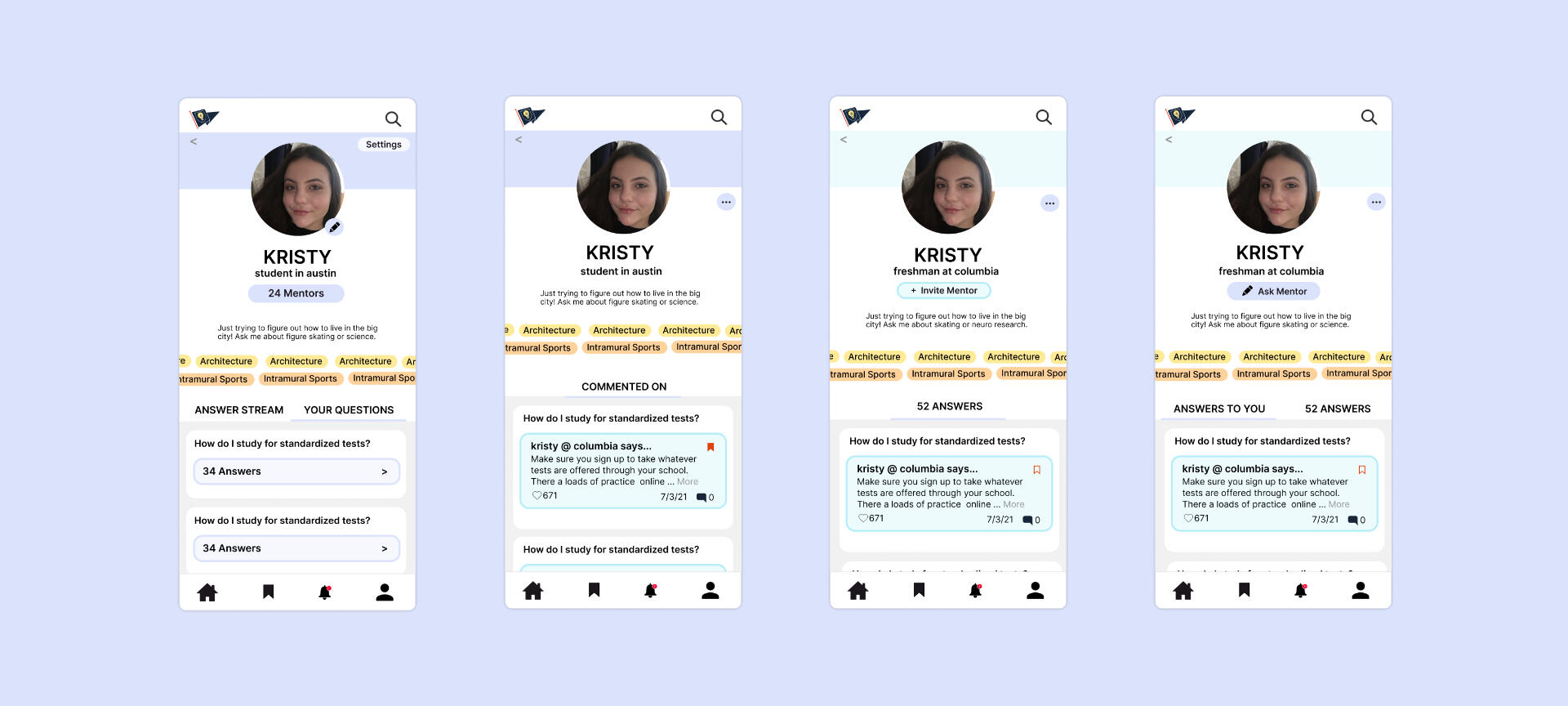 I designed a Q&A social mentorship platform where students share insight on their areas of expertise while gaining knowledge from their peers who are a couple steps ahead.