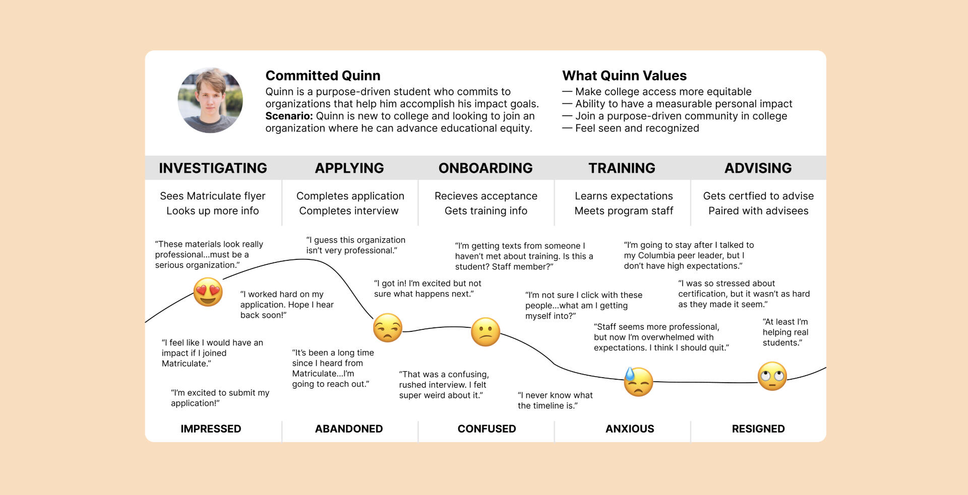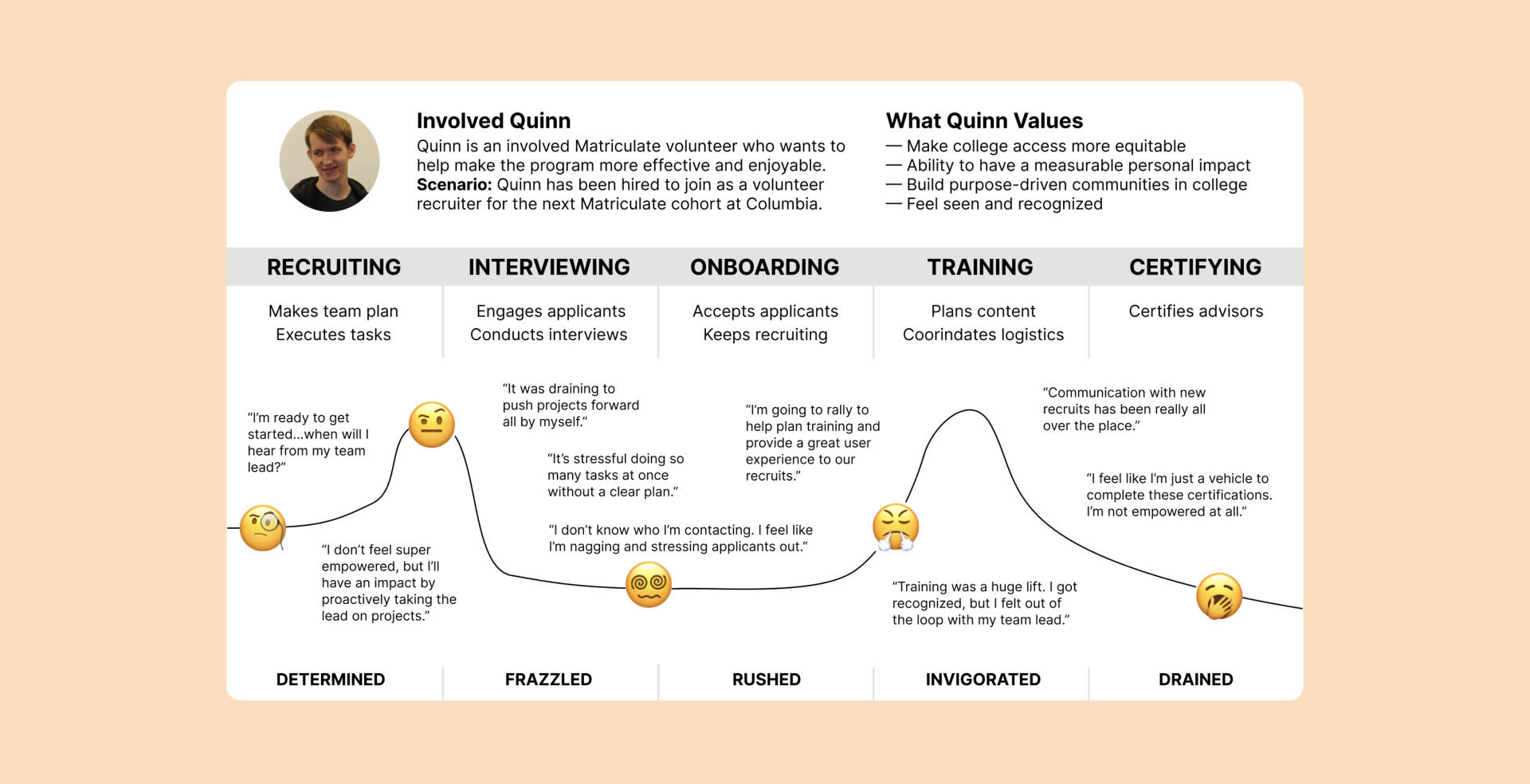 I joined Matriculate as a volunteer during my first semester of college. I ended up becoming a committed member who stayed engaged through the whole program cycle, but mapping out my recruitment, onboarding and training journey helped me isolate my personal attributes and uncover the fact that I stayed involved in spite of, not because of, my user experience.