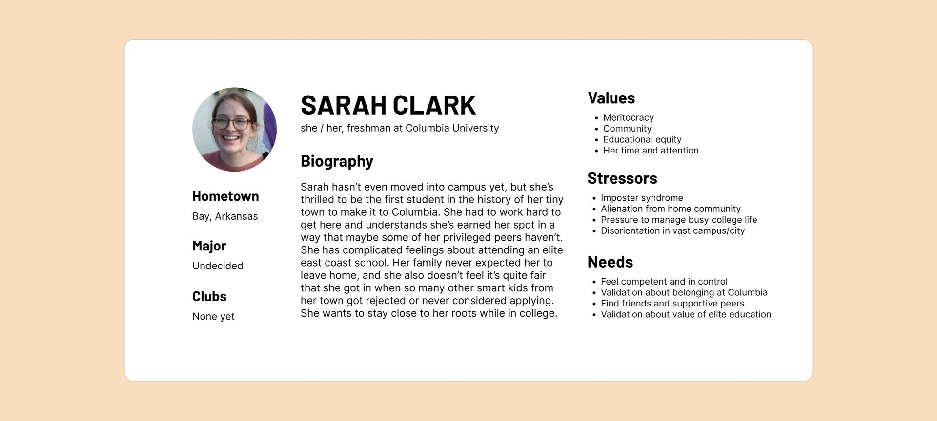 I created a Matriculate user persona by compiling data from my own personal profile as well as anecdotal and demographic data from the 100+ other volunteers I'd either worked with or recruited in my time with the program. I also incorporated insights from my interactions with Columbia students generally because I wanted to broaden our potential userbase.