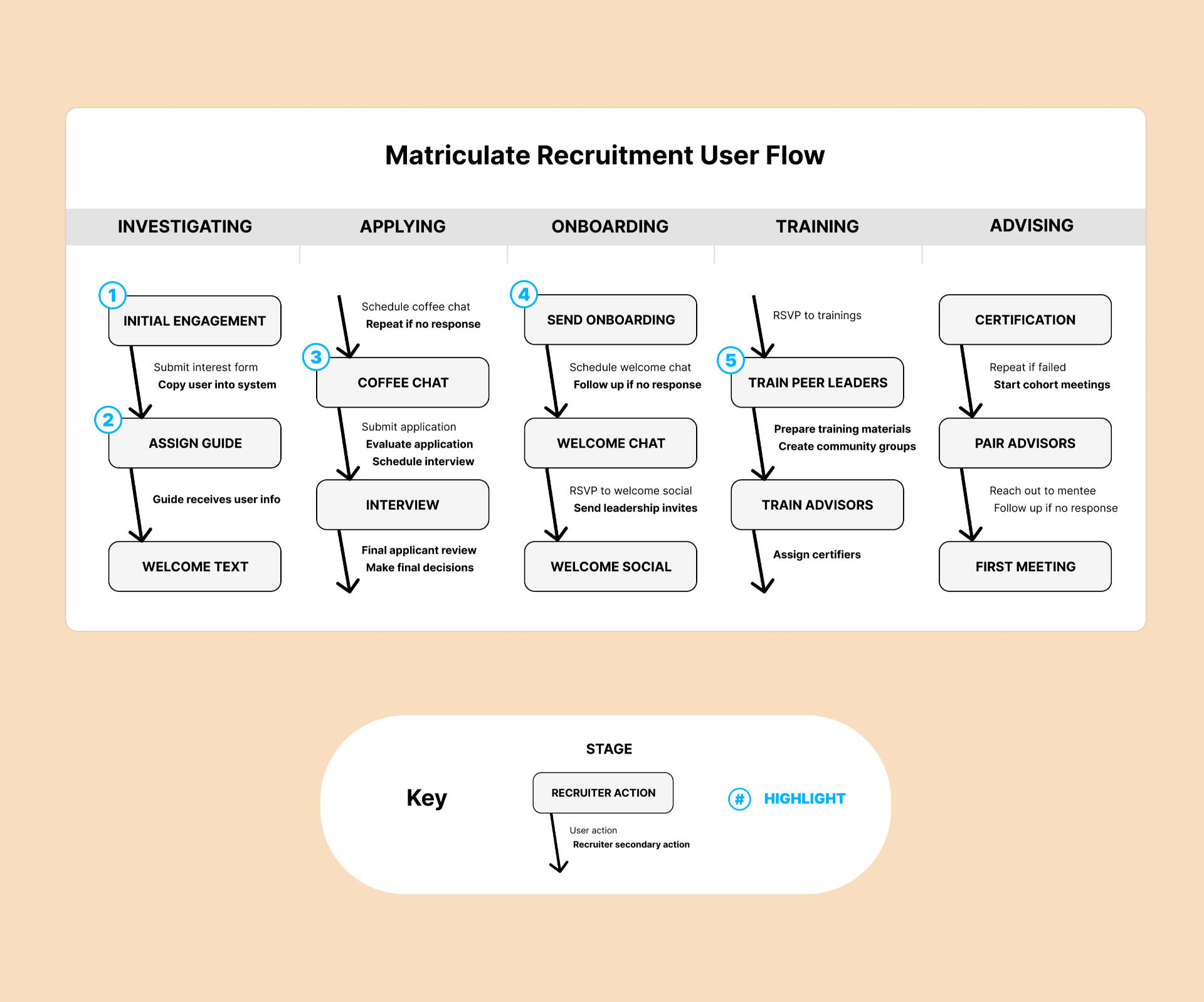 I was responsible for a multi-threaded logistical operation that involved managing my five person recruitment team, the existing 70 member corps of Matriculate volunteers, and new applicants.I went back to basics by walking through the core user flow of a Matriculate applicant. I designed and sequenced interactive elements at each stage of the process to align the user flow with the ideal user journey I'd mapped. Then, I designed tools, trainings, and systems to empower all other stakeholders to support the core user flow.