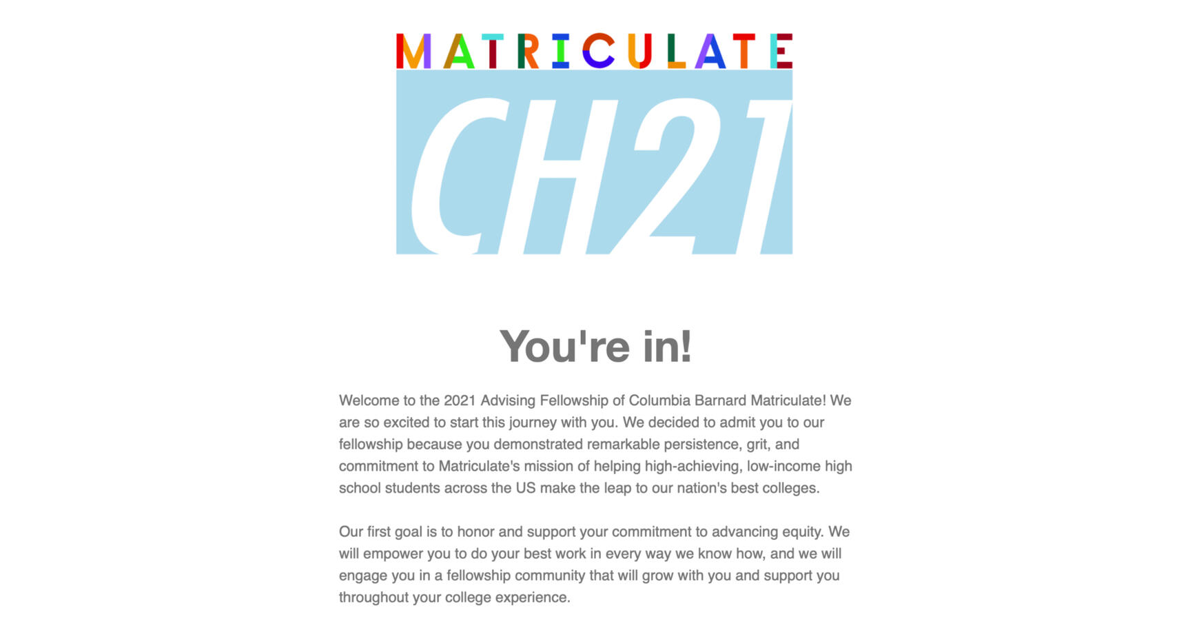 I drew from our ideal user persona to target a suite of recruitment materials to freshmen who had not yet arrived on campus. My team emphasized the new admits' amazing success and presented Matriculate as the next step.