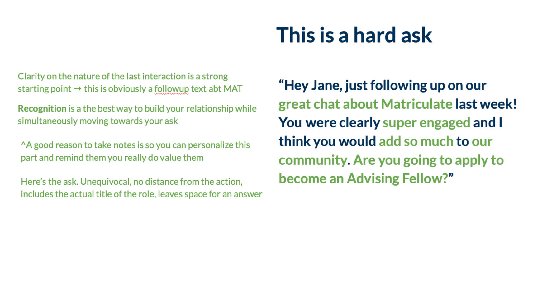 The onus falls on us recruiters to open space for applicants and make them feel welcome in Matriculate. If we provide a great user experience, every Columbia student is a potential recruit.